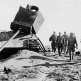 Поле боя на «Невском пятачке» 27 апреля 1942 года, когда немцы ликвидировали захваченный здесь советскими войсками плацдарм. На переднем плане уничтоженный советский танк КВ-1 и останки погибшего солдата.