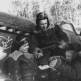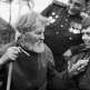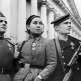 Колонна пленных проходит мимо магазина фирмы «Spa Monopole», производителя минеральной воды и газированных напитков. На двери размещен рекламный плакат фирмы.