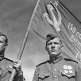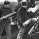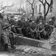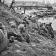 Немецкие пехотинцы укрываются в воронке на советско-германском фронте, большинство вооружены советскими пистолетами-пулеметами ППШ-41.