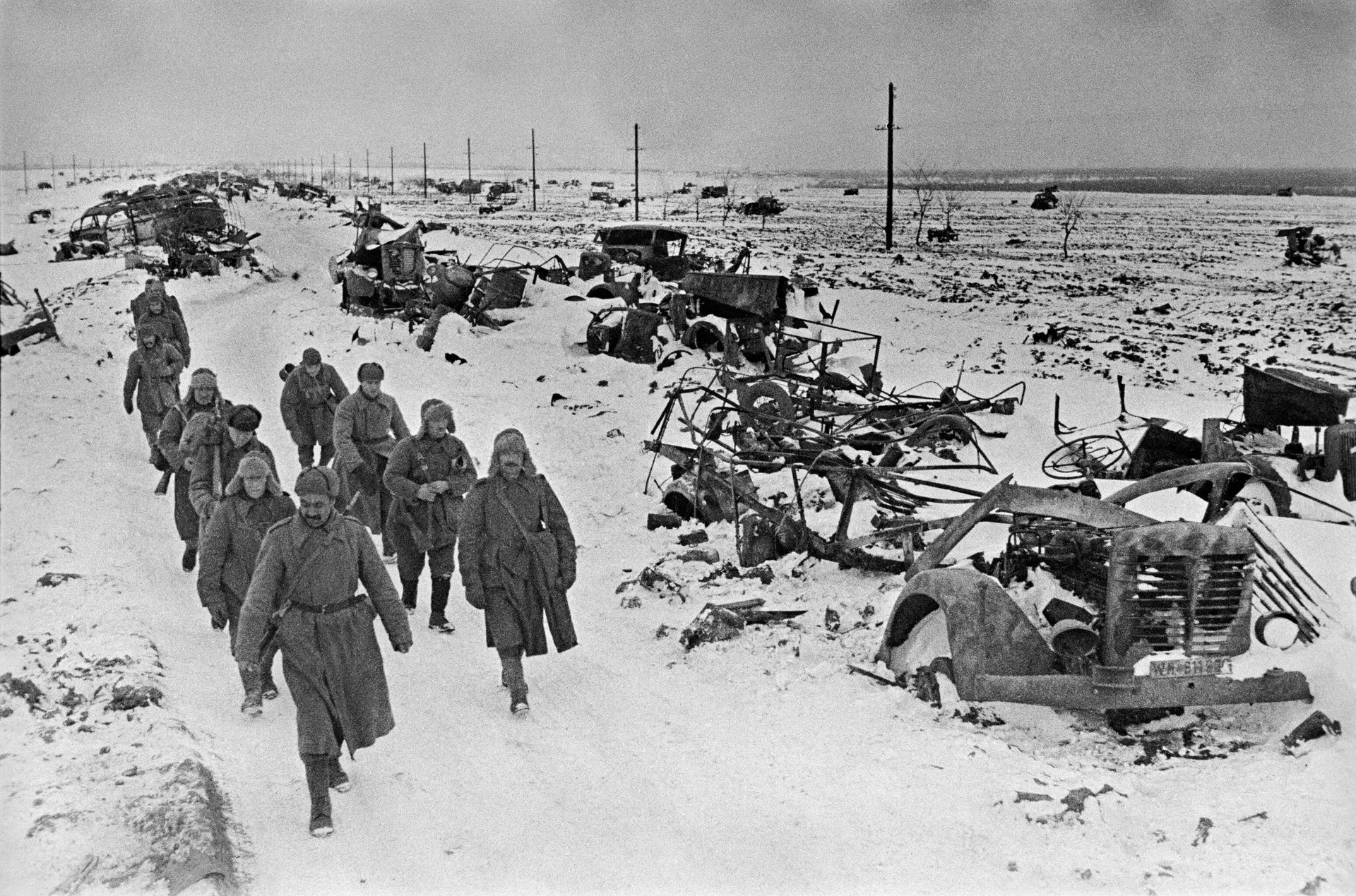 Группа бойцов РККА на марше возле колонны разбитой немецкой автотехники в Днепропетровской области. На переднем плане остов сгоревшего немецкого грузовика Bussing NAG.