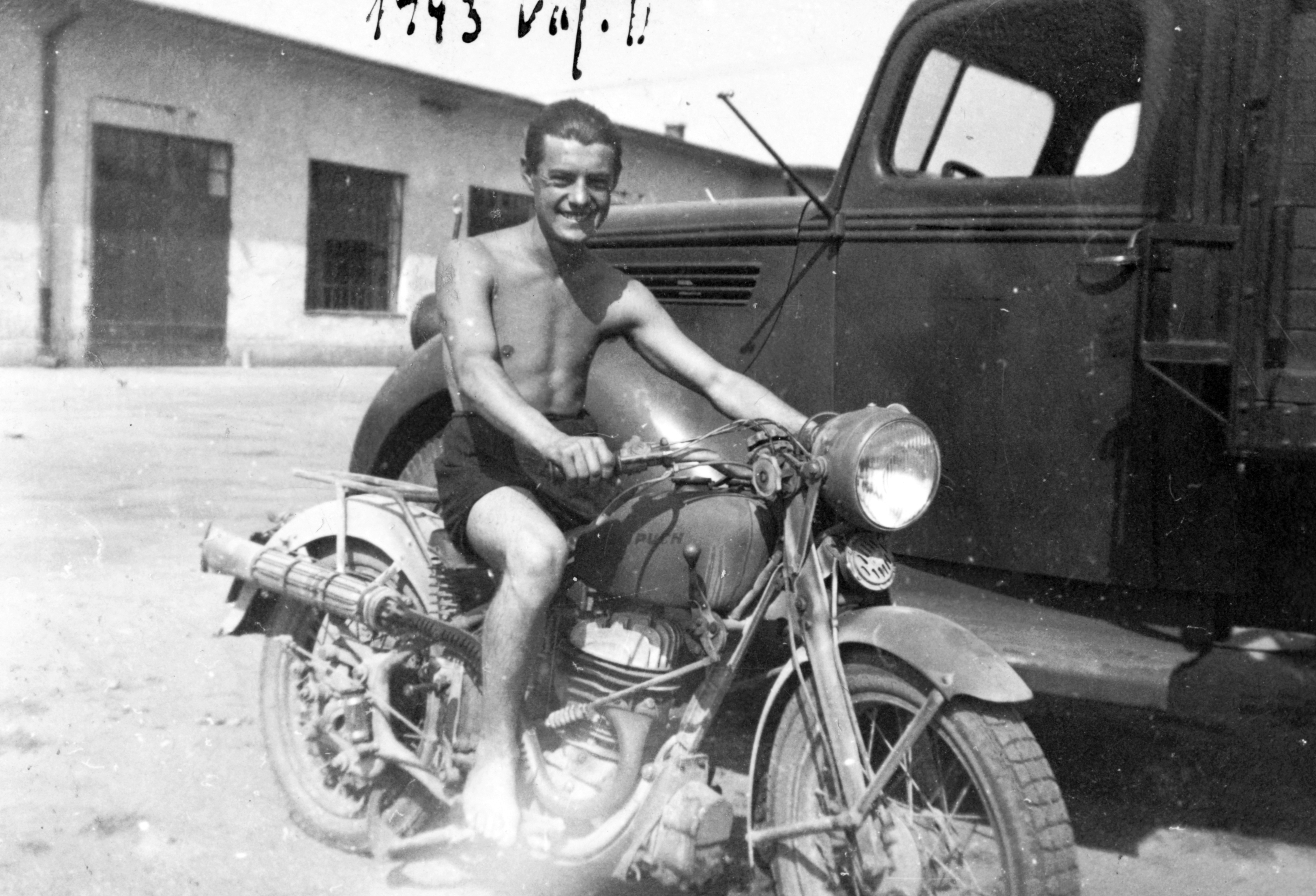 Венгерский солдат на мотоцикле Puch 350-GS. За мотоциклом — армейский грузовик Форд (Ford Truck V8 3 ton). Вероятно, снимок сделан в Венгрии.