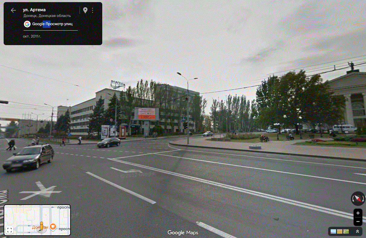 Советские солдаты на бронеавтомобиле БА-64 на пересечении ул. Артема и проспекта Гринкевича в освобожденном городе Сталино (ныне Донецк). Здание на заднем плане — современный Ворошиловский исполком.