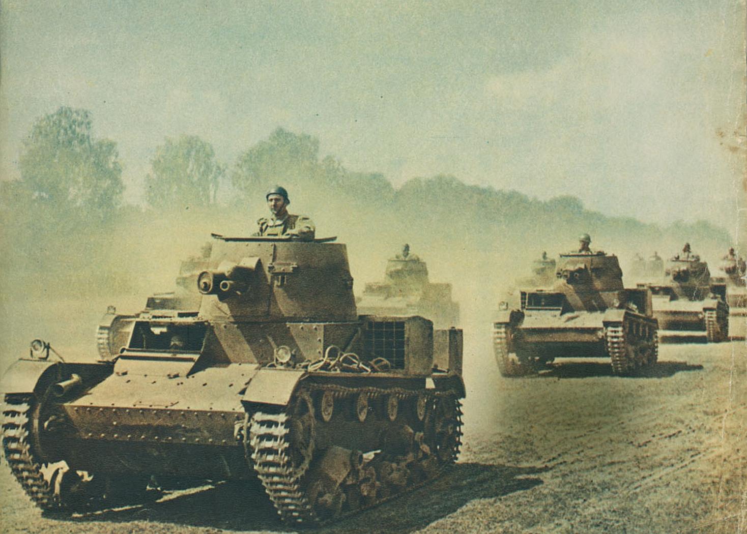 Маршевая колонна польских легких танков Vickers Mark E тип B (однобашенные) и А (двухбашенные, на заднем плане) на параде на полигоне во время учений перед войной.