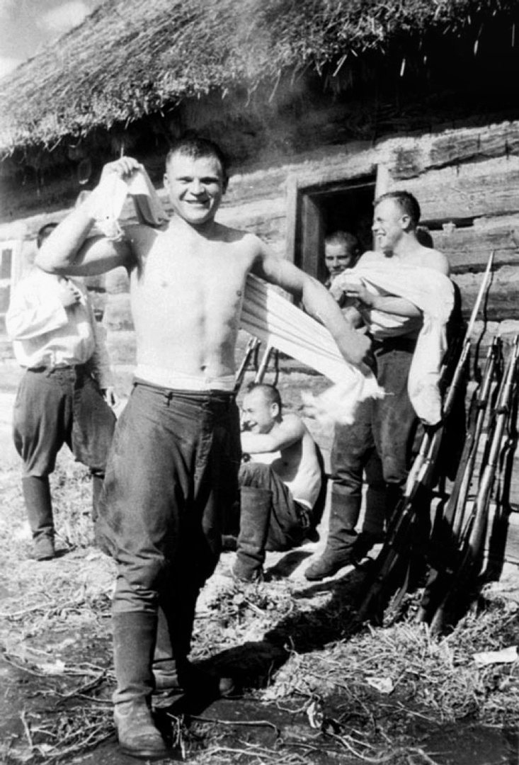 Красноармейцы отдыхают после бани.