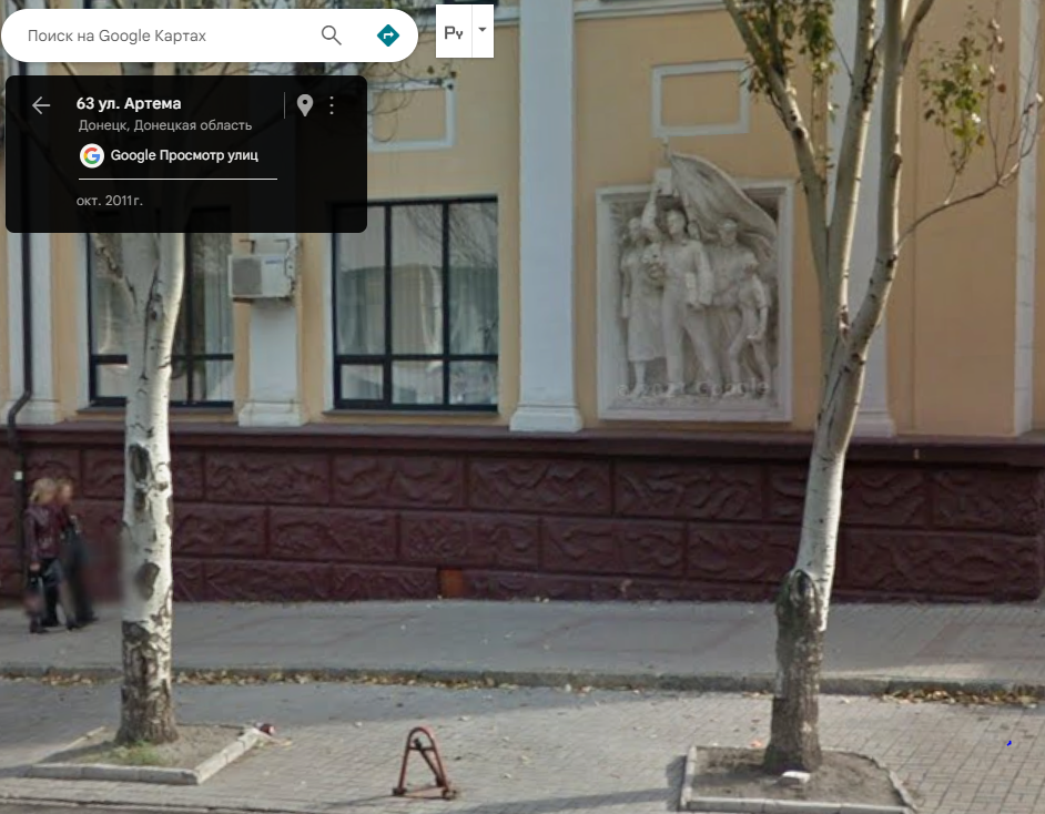Итальянские офицеры рассматривают скульптурную композицию на здании в городе Сталино