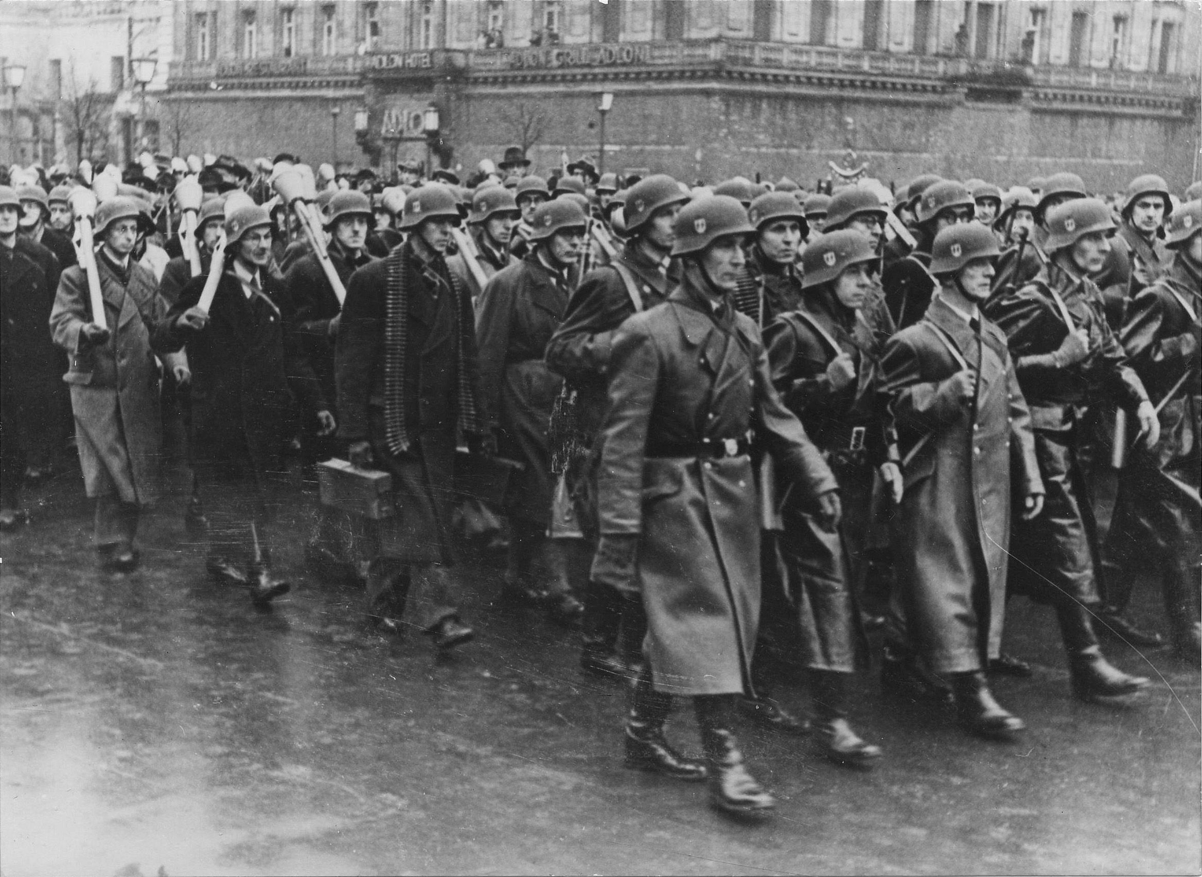 Парад фольксштурма после церемонии присяги на бульваре Унтер-ден-Линден (Unter-den-Linden) в Берлине 12 ноября 1944. В этот день тысячи мужчин приняли присягу в центре Берлина в присутствии рейхсминистра Йозефа Гебельса. Ополченцы маршируют по направлению к Бранденбургским воротам, на заднем плане видно здание отеля «Адлон» (Hotel Adlon).