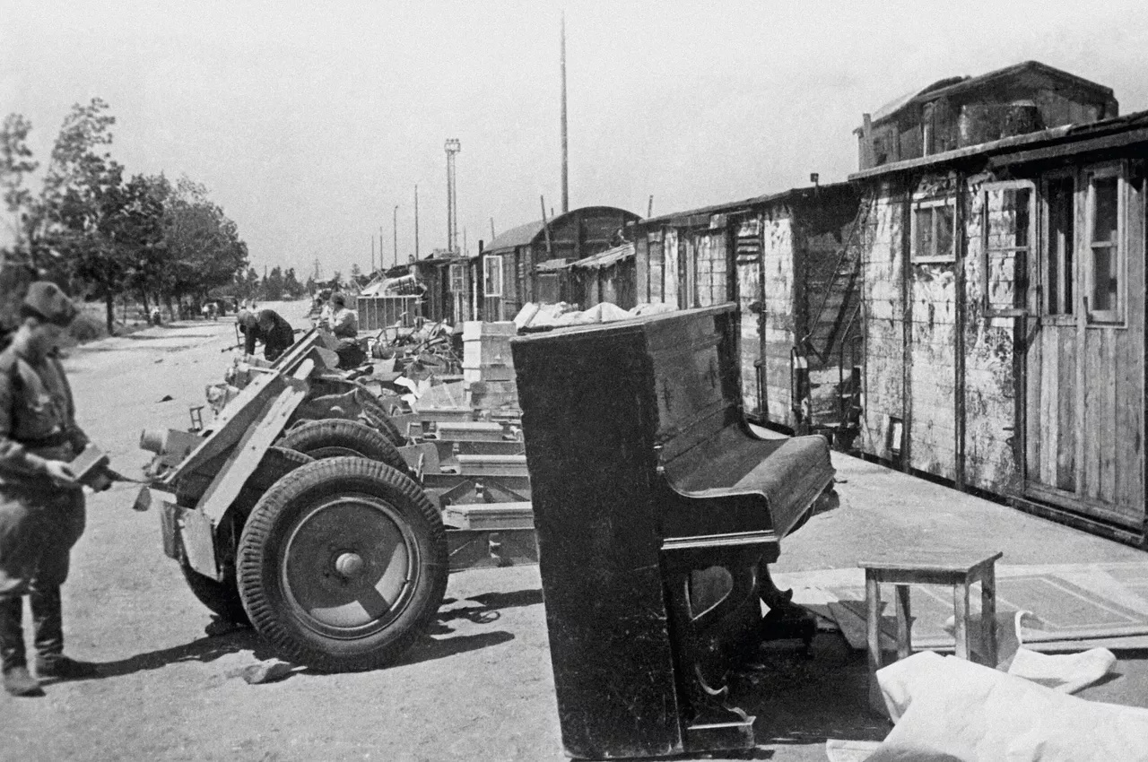 Немецкие 75-мм пехотные орудия LeIG 18 (образца 1927 г.) и пианино, брошенные отступающими частями вермахта на станции Орша.