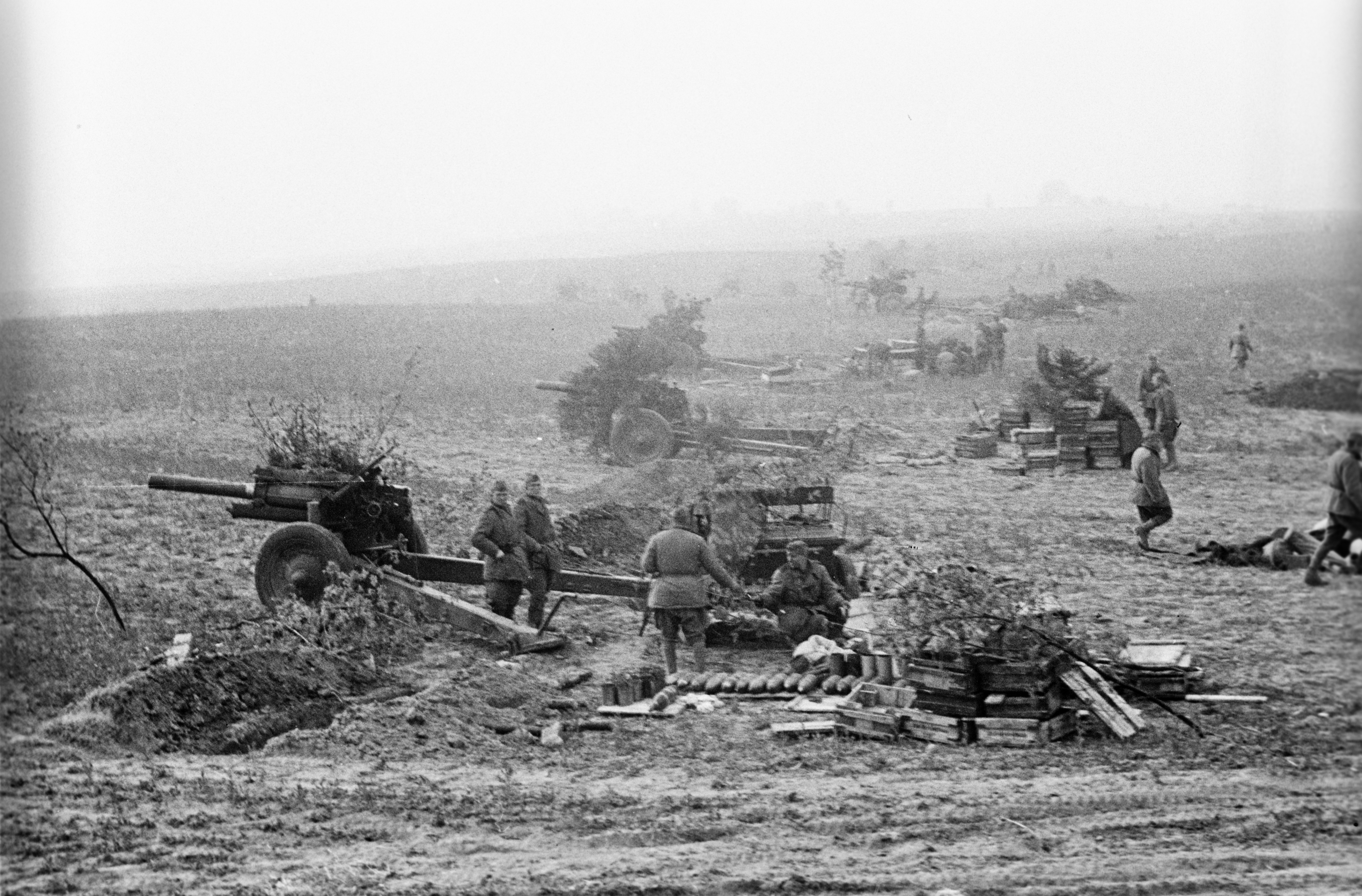 Гаубицы стоят на прямой наводке. Значит расстояние до цели 500-600 м. Орудия стоят в чистом поле, а расчеты ходят в полный рост. Довольно странная огневая позиция…