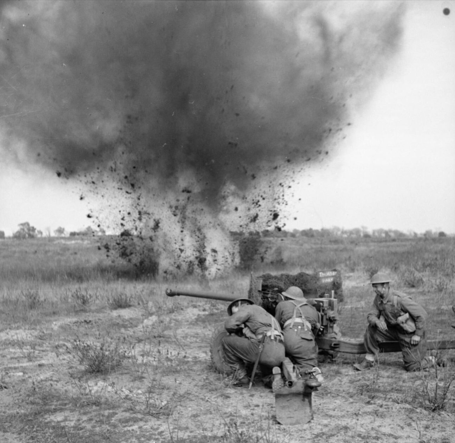 Расчет британской 57-мм противотанковой пушки Ordnance QF 6-pounder 2-го батальона Шервудского егерского (Ноттингемширского и Дербиширского) полка (Sherwood Foresters (Nottinghamshire and Derbyshire Regiment)) под минометным обстрелом ведет бой в районе Салерно (Salerno).