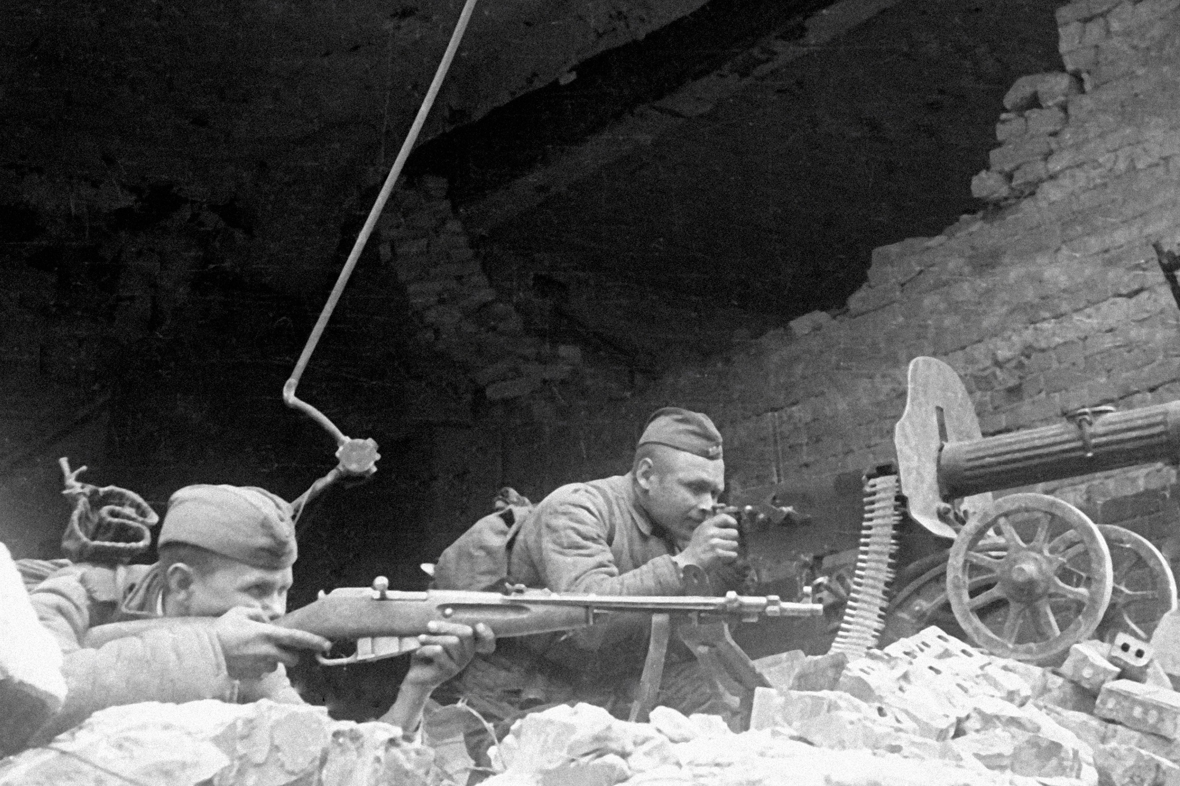 Красноармейцы с пулеметом «Максим» на груде камней в уличном бою в Берлине