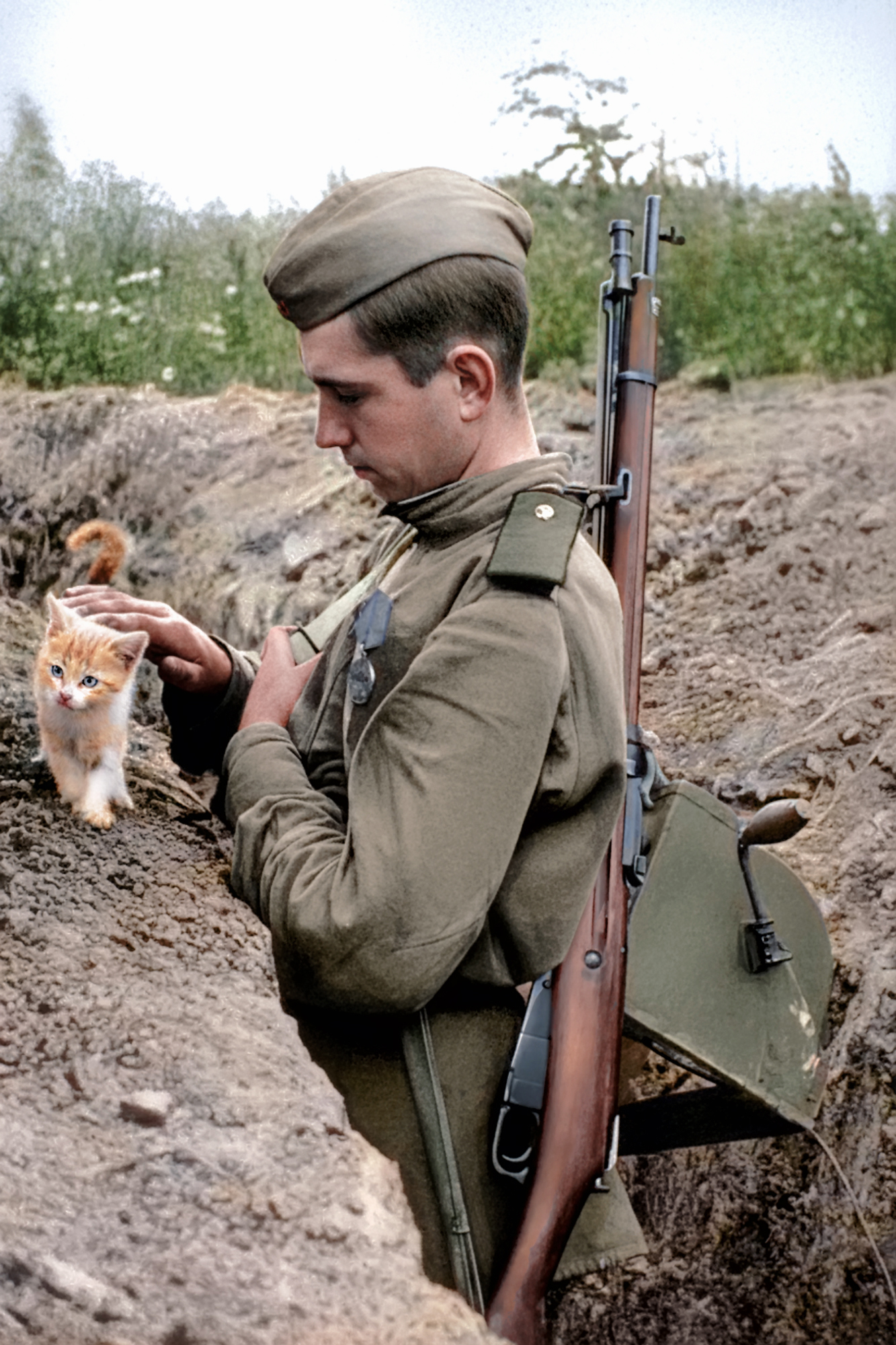 Вспоминая своё деревенское детство, могу сказать, что котята рожденные на свободе (под полом деревенского дома), очень дикие и с трудом привыкают к человеку. Тут по всей видимости тоже случай, когда кошечка приплод принесла вне домашних условий, однако эта «зверюга» среди ужасов войны всё же потянулась к человеку.