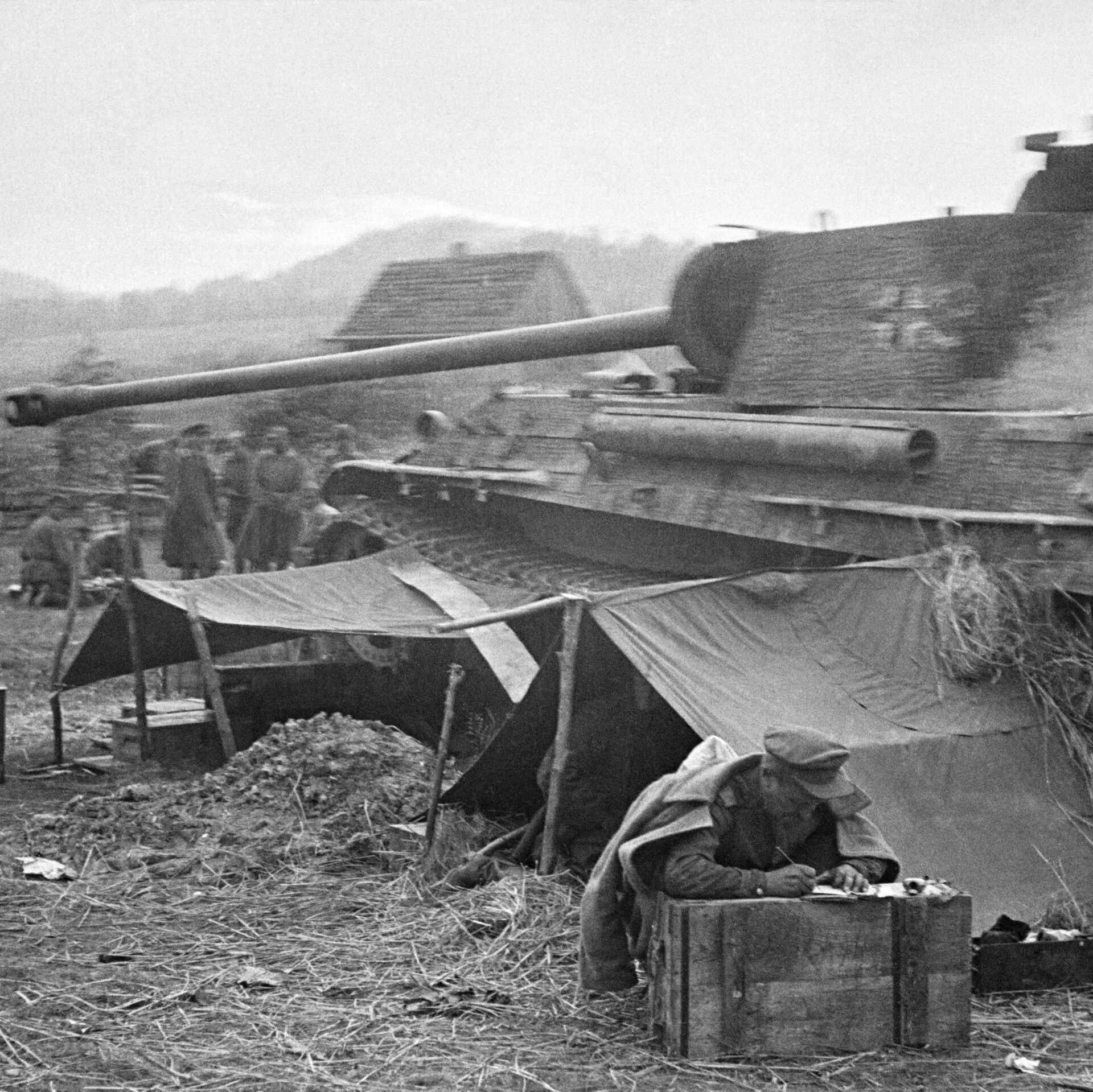 Бойцы 1-й отдельной чехословацкой пехотной бригады отдыхают у подбитого немецкого танка Pz.Kpfw. V «Пантера» на Украине. Киевская наступательная операции.