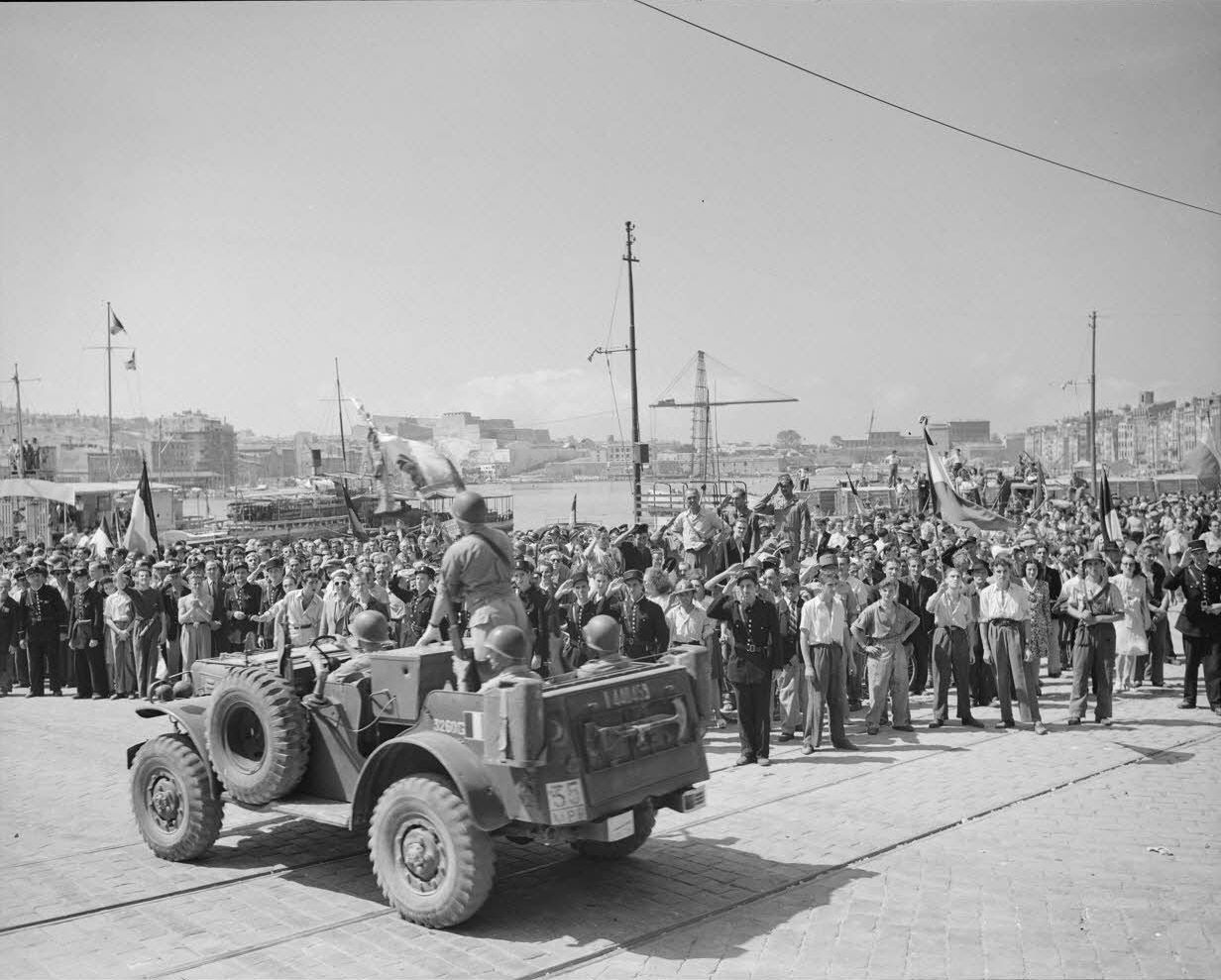 Парад войск французской 3-й алжирской пехотной дивизии (3e division d’infanterie algérienne, 3e DIA) на набережной кэ-де-Бельж (quai des Belges) в Старом порту Марселя (Marseille) во время празднования освобождения города.