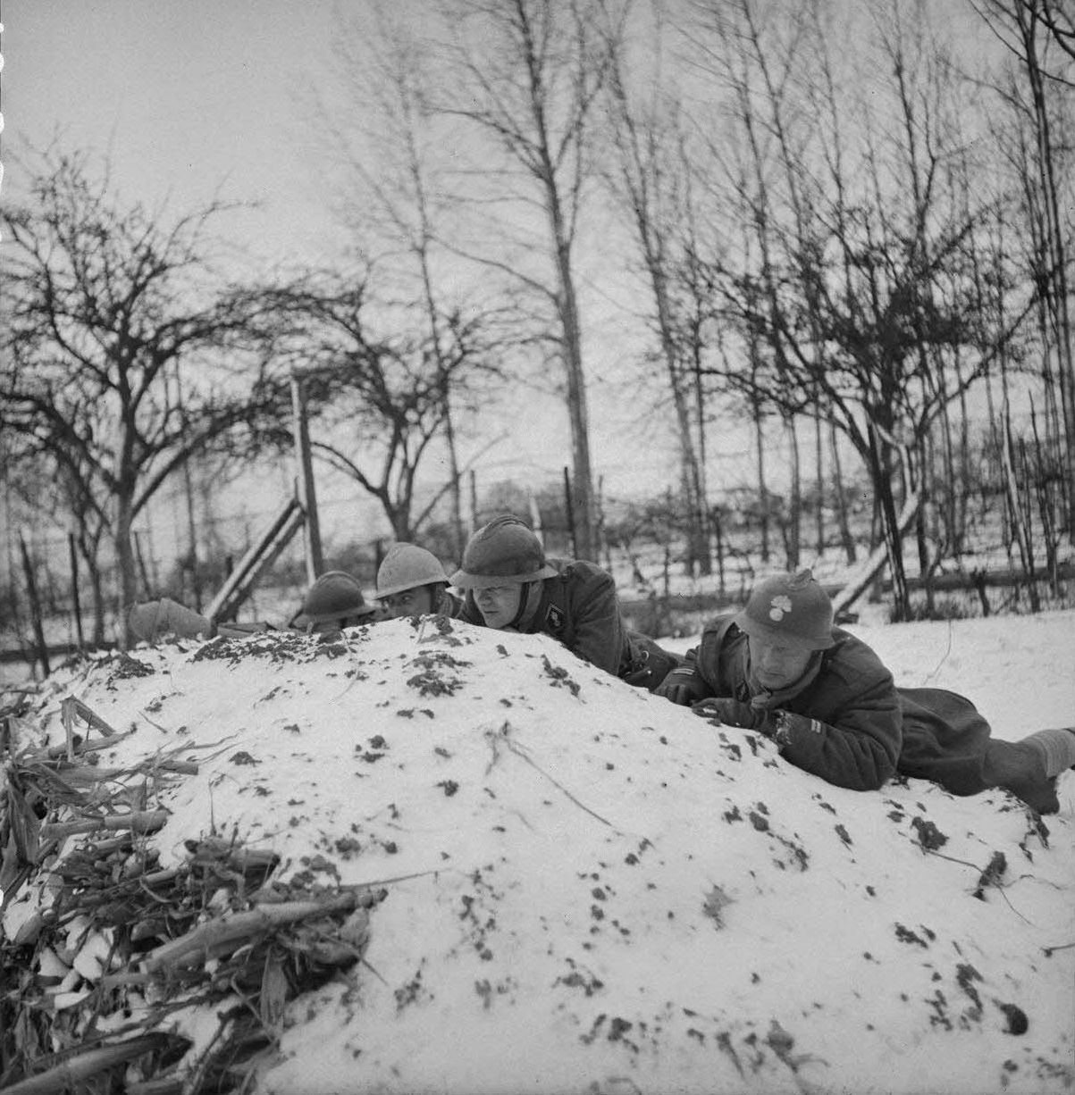 Французские жандармы Республиканской гвардии укрываются за насыпью во время боев за Кильстет (Kilstett).
