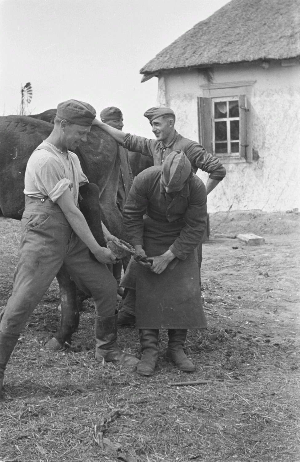 Рядовой вермахта Франц Грассер (Franz Grasser, 26.03.1911 — 13.11.1944, слева) из 167-й пехотной дивизии помогает подковать лошадь в селе в Курской области (ныне один из районов Белгородской области). Предположительно, снимок сделан весной-летом 1943 года, до боев на Курской дуге.
