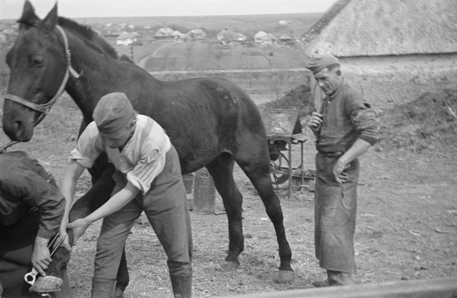 Рядовой вермахта Франц Грассер (Franz Grasser, 26.03.1911 — 13.11.1944, в белой рубахе) из 167-й пехотной дивизии помогает подковать лошадь в селе в Курской области (ныне один из районов Белгородской области).
