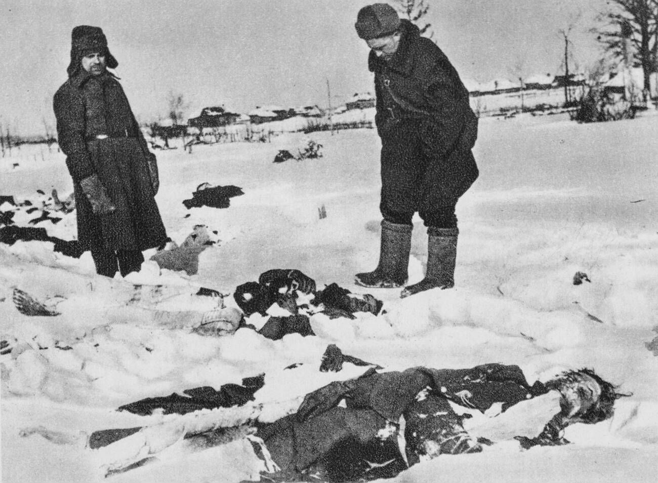 Командир РККА у тел немецких солдат, погибших во время Битвы за Москву