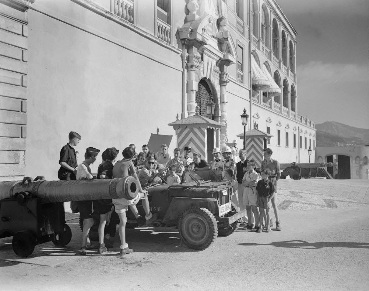 Корреспонденты французской Кинофотослужбы вооруженных сил (Service cinématographique des armées, SCA) на джипе «Виллис» (Willys MB) с местными жителями и Княжескими карабинерами у княжеского дворца в г. Монако (Monaco-Ville).