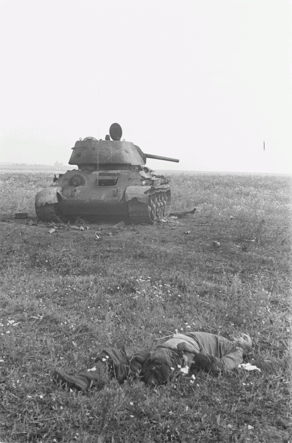 Советский танк Т-34, подбитый и сгоревший на окраине села Покровка (ныне Ивнянского района Белгородской области, в 40 км юго-западнее Прохоровки). Машина из 1-го батальона одной из танковых бригад 29-го танкового корпуса 5-й гвардейской танковой армии. На переднем плане лежит погибший советский военнослужащий.