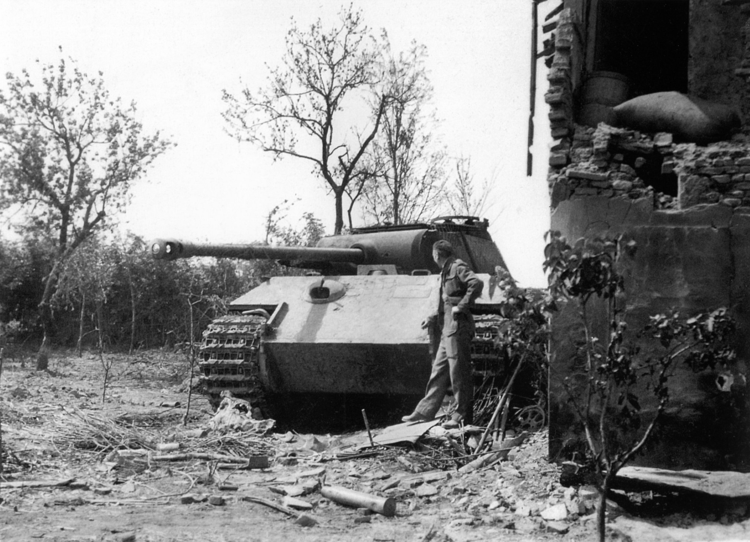 Британский солдат Билл Гест (Bill Guest) у немецкого танка «Пантера» Pz.Kpfw. V Panther 1-го батальона 26-го танкового полка (l./Pz.Rgt.26), подбитого в Палаццо Гуэррино (Palazzo Guerrino). На башне машины установлены нестандартные пластины дополнительной брони.