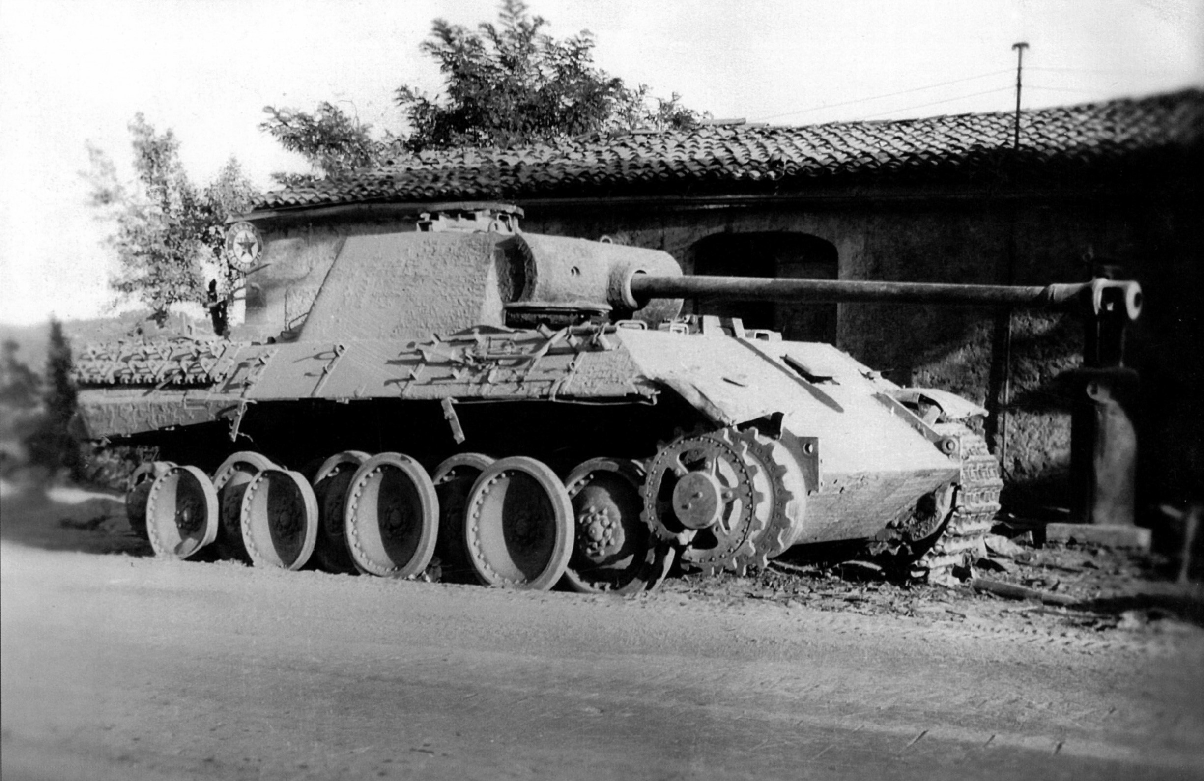 Поврежденный немецкий танк «Пантера» Pz.Kpfw. V 1-го батальона 4-го танкового полка (l./Pz.Rgt.4), брошенный у здания на обочине дороги. Корпус машины модификации Ausf. D, башня Ausf. A.