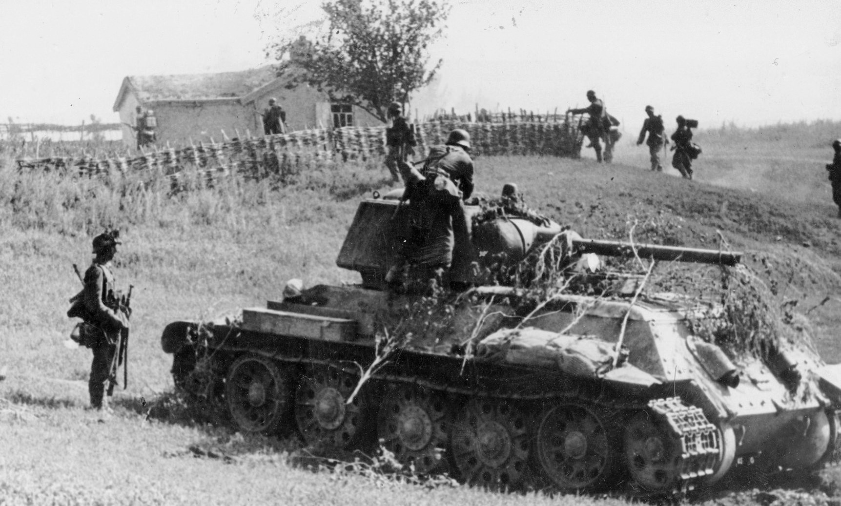 Немецкие солдаты осматривают советский танк Т-34, брошенный на окраине советского села.