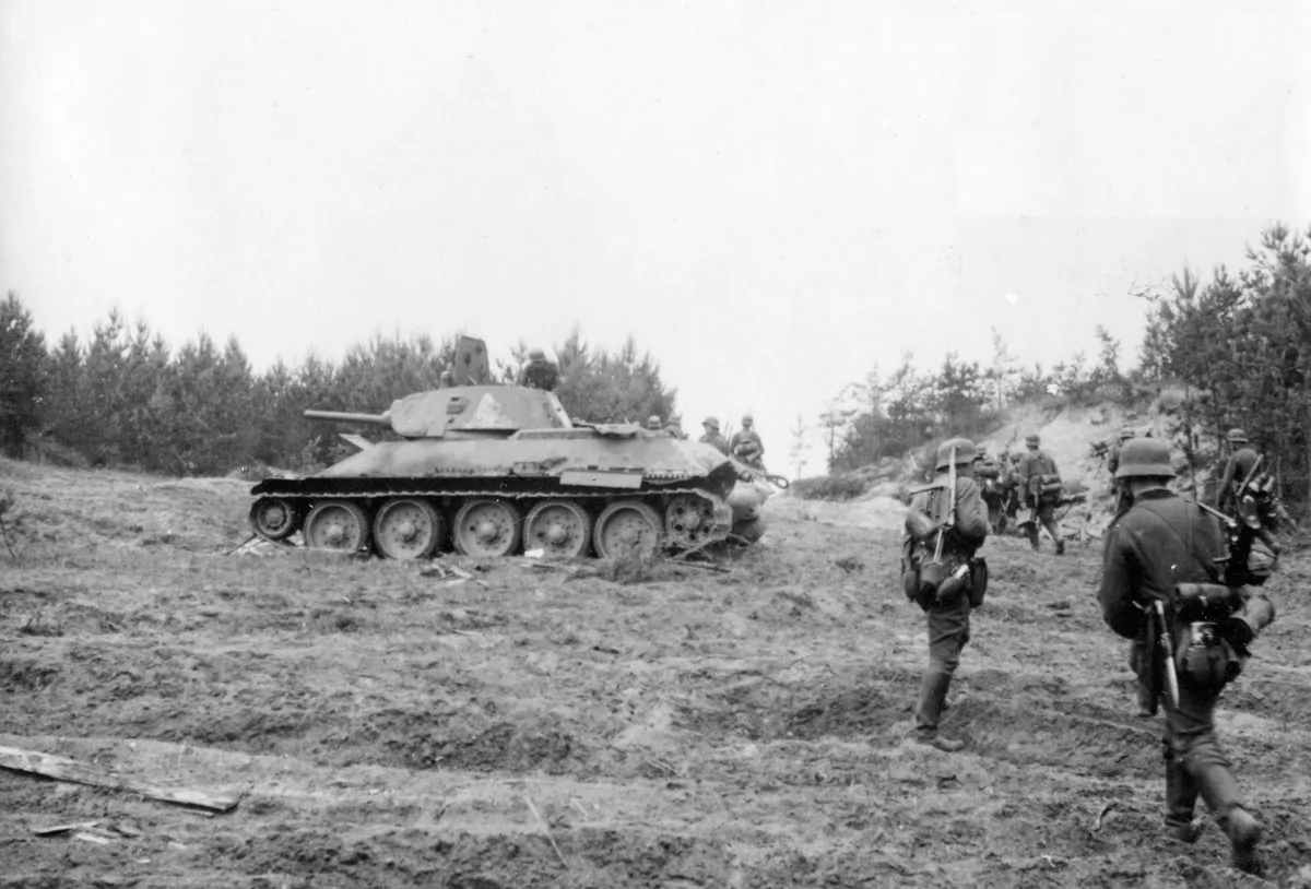 Подразделение немецкой пехоты проходит мимо брошенного советского танка Т-34 (с орудием Л-11).