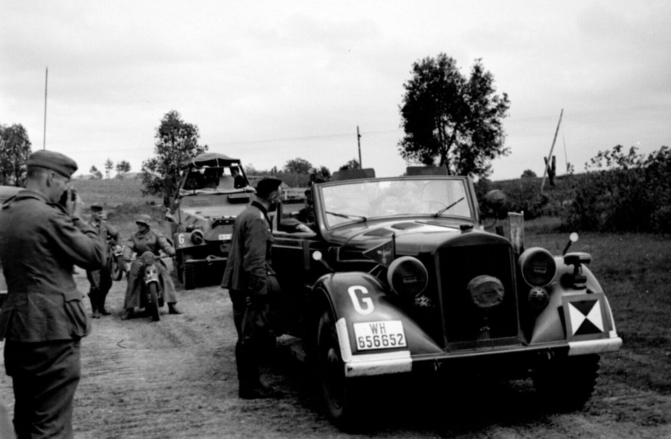 Командующий 2-й танковой группой (2.Panzer-Gruppe) генерал-полковник Гейнц Гудериан (Heinz Wilhelm Guderian, 1888–1954) слушает подчиненного. В кадре штабной автомобиль Horch 901 Kfz.21 с регистрационным номером WH-656652. Предположительно, место съемки в районе р. Березина, Смоленская область.