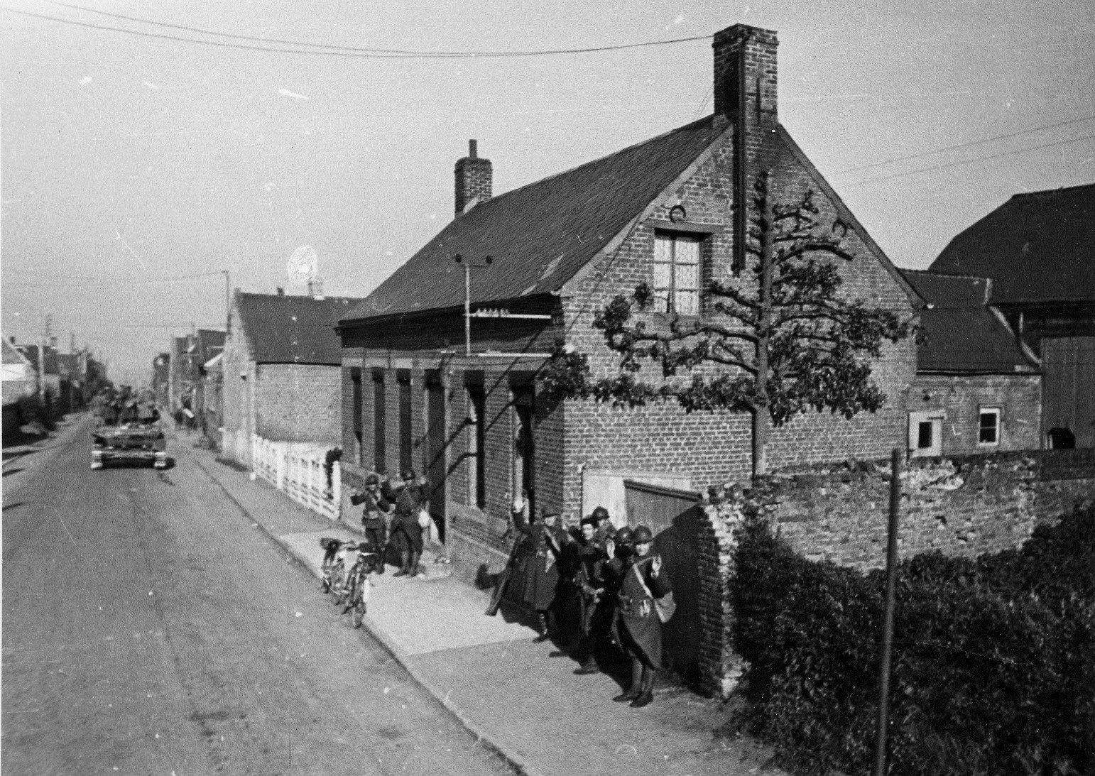 Танковая колонна вермахта движется по улице населенного пункта мимо сдающихся в плен французских солдат.