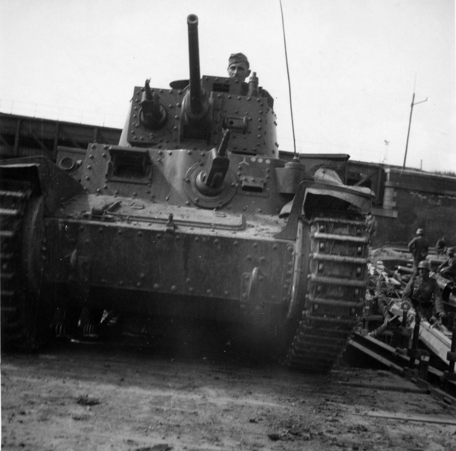 Танк Pz.Kpfw. 38(t) (трофейный чехословацкий танк LT vz.38) 7-й танковой дивизии (7. Panzer-Division) вермахта переправляется по наведенному мосту.