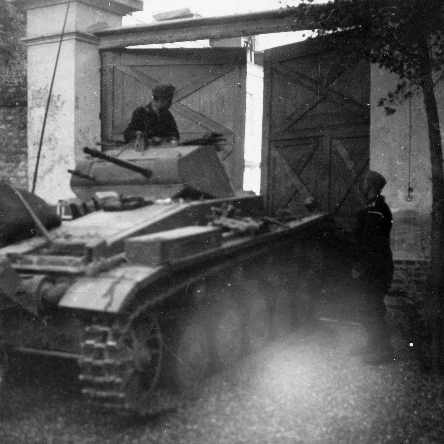 Немецкий танк Pz.Kpfw. II выбивает ворота на улице населенного пункта