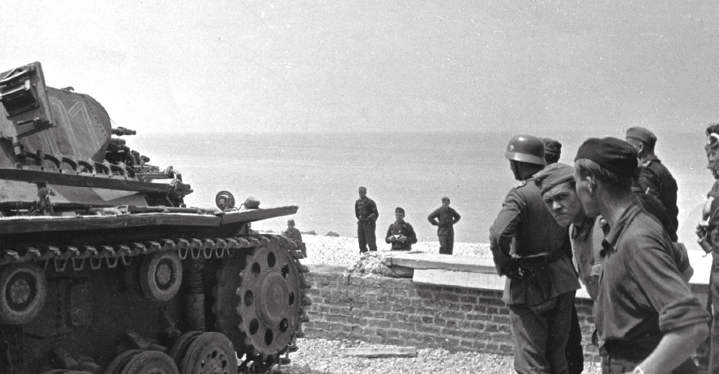 Танк Pz.Kpfw. III 7-й танковой дивизии (7. Panzer-Division) вермахта съезжает с набережной на побережье Ла-Манша, в районе Пти-Даль (Petites Dalles). На снимке запечатлен момент, когда командир дивизии генерал-майор Эрвин Роммель в сопровождении нескольких офицеров спустился на пляж. Эта машина запечатлена на следующей серии фотографий.