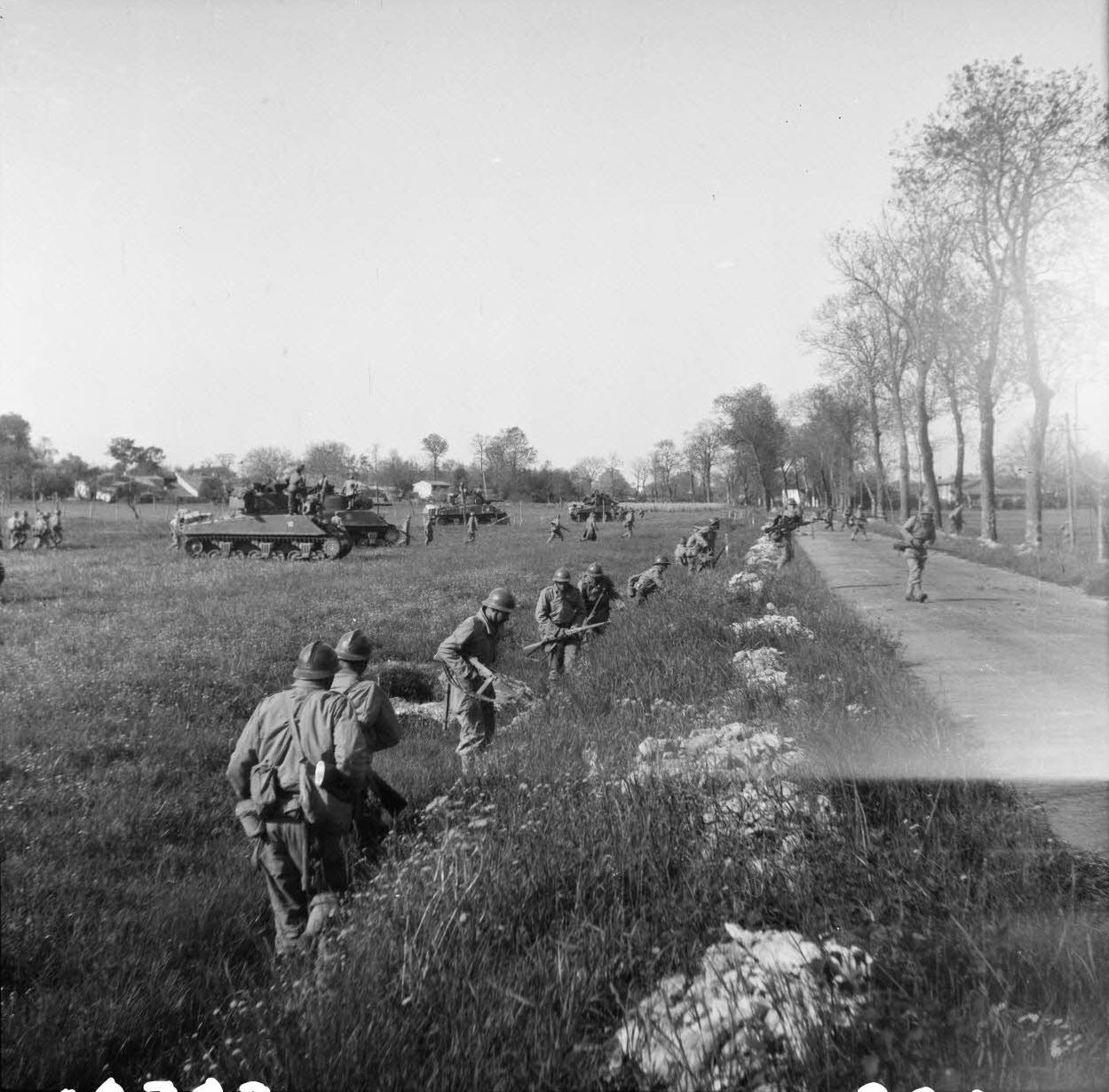 Французские пехотинцы, предположительно 4-го зуавского полка (4e régiment de zouaves, 4e RZ), наступают под прикрытием танков «Шерман» (M4 Sherman) Бронетанкового полка морской пехоты 2-й бронетанковой дивизии (Régiment blindé de fusiliers-marins, RBFM; 2e division blindée, 2e DB) в районе Сента (Saintes) во время чистки Руайанского котла.