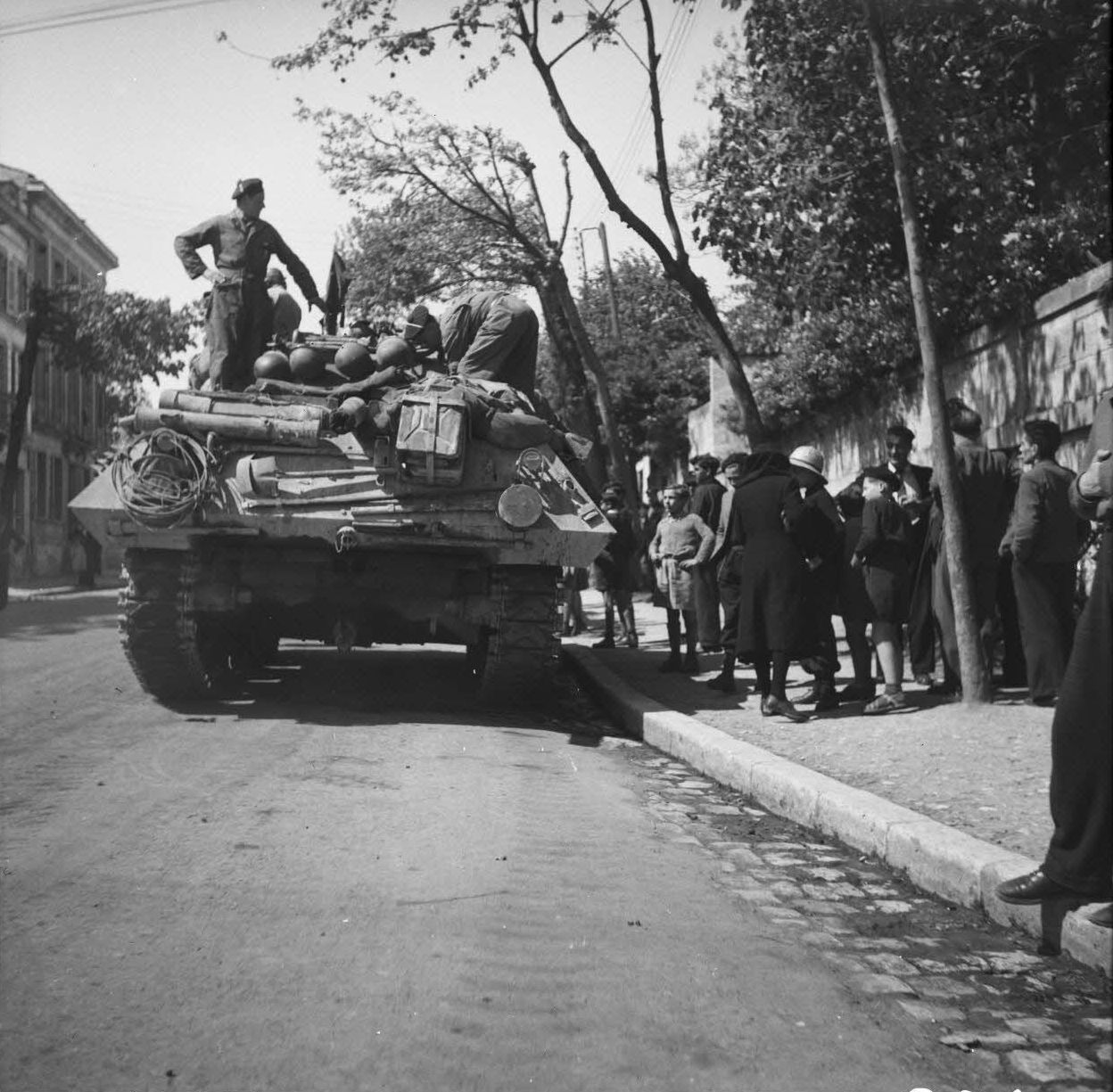 Жители освобожденного Сента (Saintes) приветствуют вошедшие в город части Бронетанкового полка морской пехоты 2-й бронетанковой дивизии (Régiment blindé de fusiliers-marins, RBFM; 2e division blindée, 2e DB).