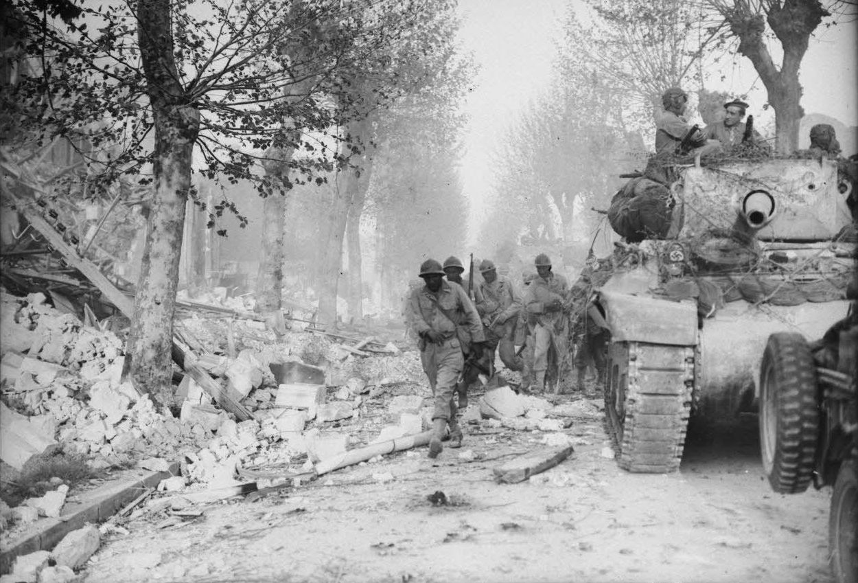 Французская бронетехника из состава Бронетанкового полка морской пехоты 2-й бронетанковой дивизии (Régiment blindé de fusiliers-marins, RBFM; 2e division blindée, 2e DB) и пехотинцы 4-го зуавского полка (4e régiment de zouaves, 4e RZ) входят в разрушенный Руайан (Royan), департамент Приморская Шаранта, Франция, апрель 1945 г.