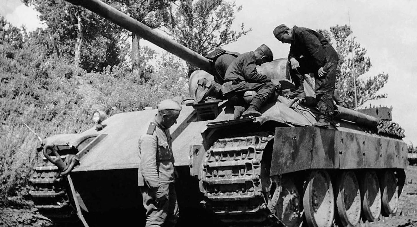 Красноармейцы осматривают танк вермахта «Пантера», захваченный в боях на Курской дуге [3]