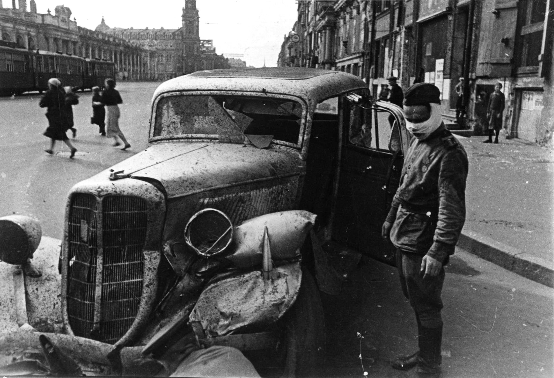 Раненый советский старшина у разбитого в результате вражеского артобстрела легкового автомобиля ГАЗ-М-1 на углу проспекта 25-го Октября и улицы 3-го Июля (с 1944 г. — Невский проспект и улица Садовая) блокадного Ленинграда.