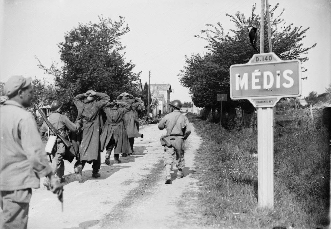 Французские солдаты из 4-го зуавского полка 2-й бронетанковой дивизии (4e régiment de zouaves, 4e RZ; 2e division blindée, 2e DB) конвоируют пленных немцев, сдавшихся после капитуляции немецких сил в Руайанском котле, Меди (Médis).