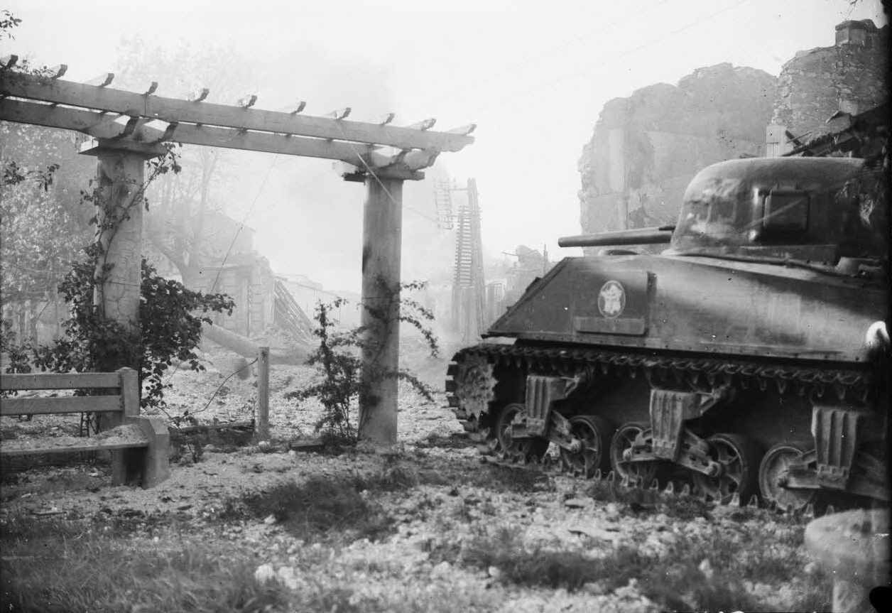 Французский танк «Шерман» (M4A2 Sherman) с собственными именем «Нанси» (Nancy) из 4-го эскадрона 12-го кирасирского полка 2-й бронетанковой дивизии (12e régiment de cuirassiers, 12e RC; 2e division blindée, 2e DB) на развалинах одного из городских казино в Руайане (Royan). Танк капитана Эрнеста Годе (Ernest Gaudet) из штабного взвода.