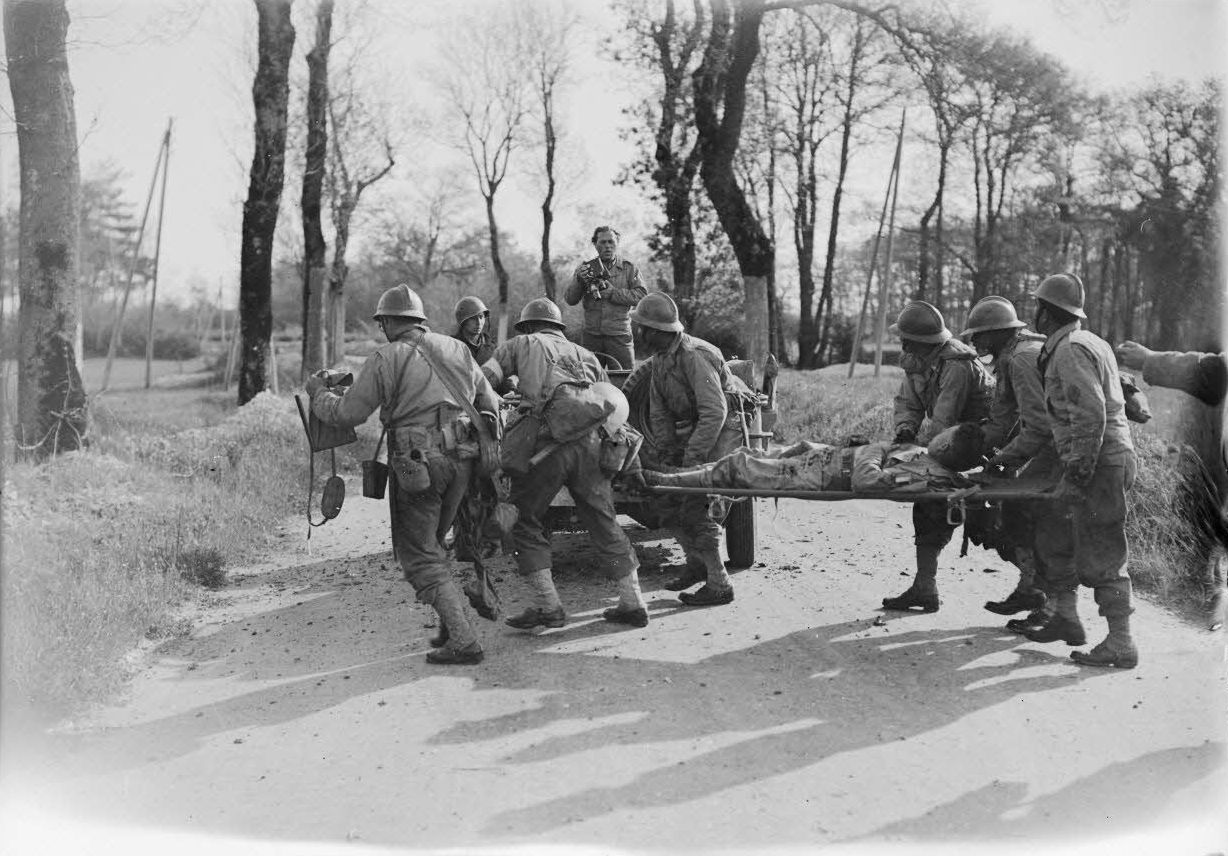 Французские солдаты 4-го зуавского полка 2-й бронетанковой дивизии (4e régiment de zouaves, 4e RZ; 2e division blindée, 2e DB) переносят на носилках раненого для эвакуации в госпиталь, Руайан (Royan).