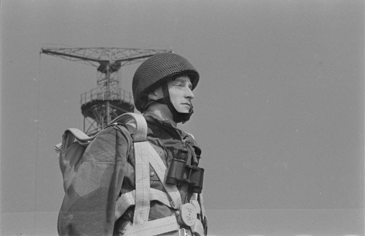 Французский десантник из Французской роты САС (French SAS Squadron) в ожидании посадки на самолет для последующего учебного прыжка с парашютом.