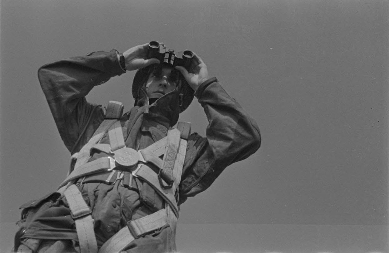 Французский десантник из Французской роты САС (French SAS Squadron) осматривает местность в бинокль.