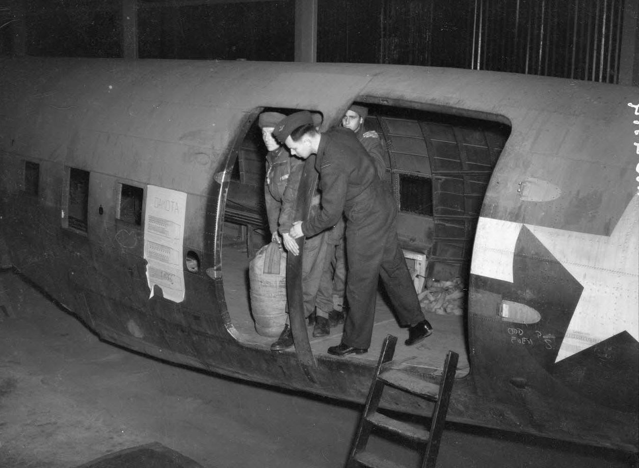 Инструктор Французской роты САС (French SAS Squadron) показывает курсантам положение, которое необходимо занимать перед прыжком из самолета с помощью макета корпуса транспортного самолета «Скайтрейн» (Douglas C-47 Skytrain).