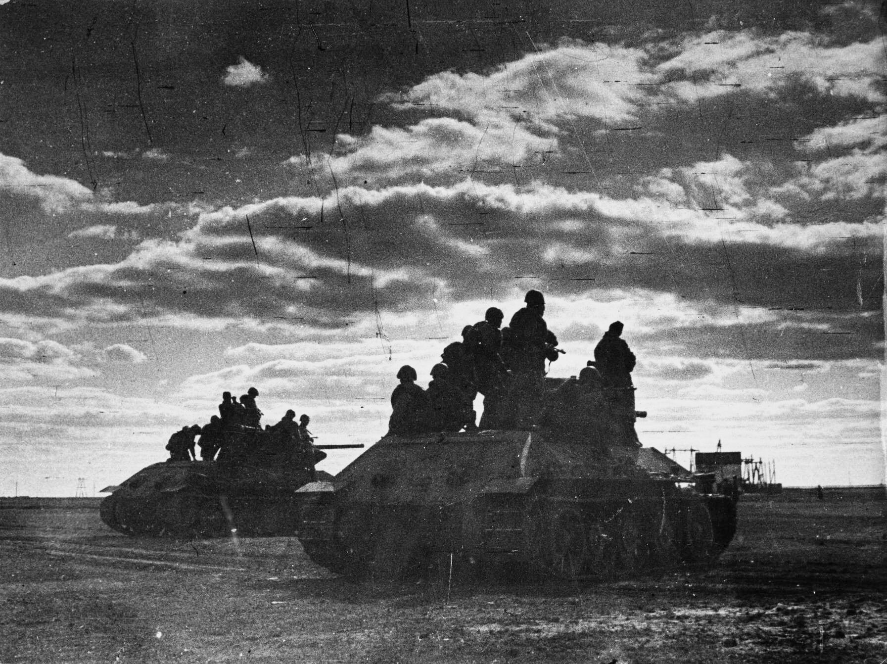 Советский танковый десант на танках Т-34 в районе Сталинграда.
