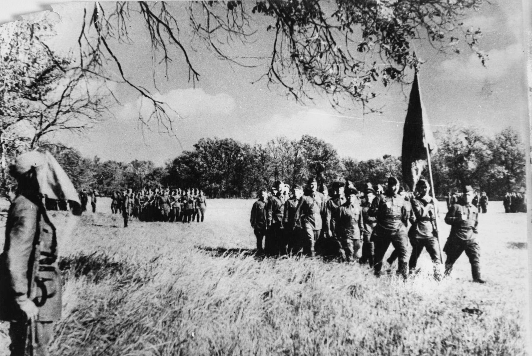 Прохождение торжественным маршем личного состава мотострелково-пулеметного батальона 99-й танковой бригады после принятия военной присяги. Ряды бригады пополнили сталинградцы, вставшие на защиту родного города.