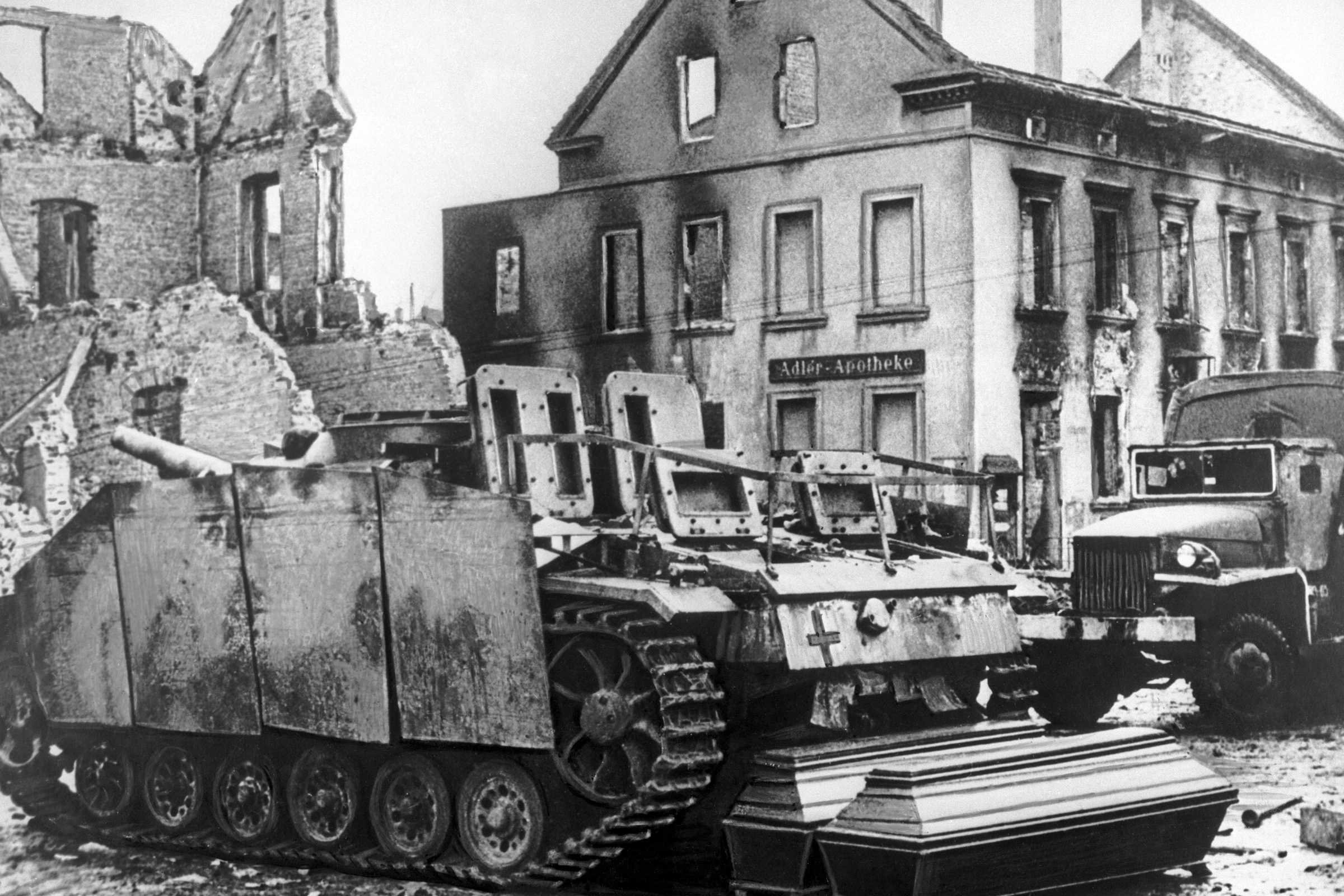 Немецкая САУ StuH. 42, брошенная на городской улице. В кадре американский армейский грузовик Studebaker US6.