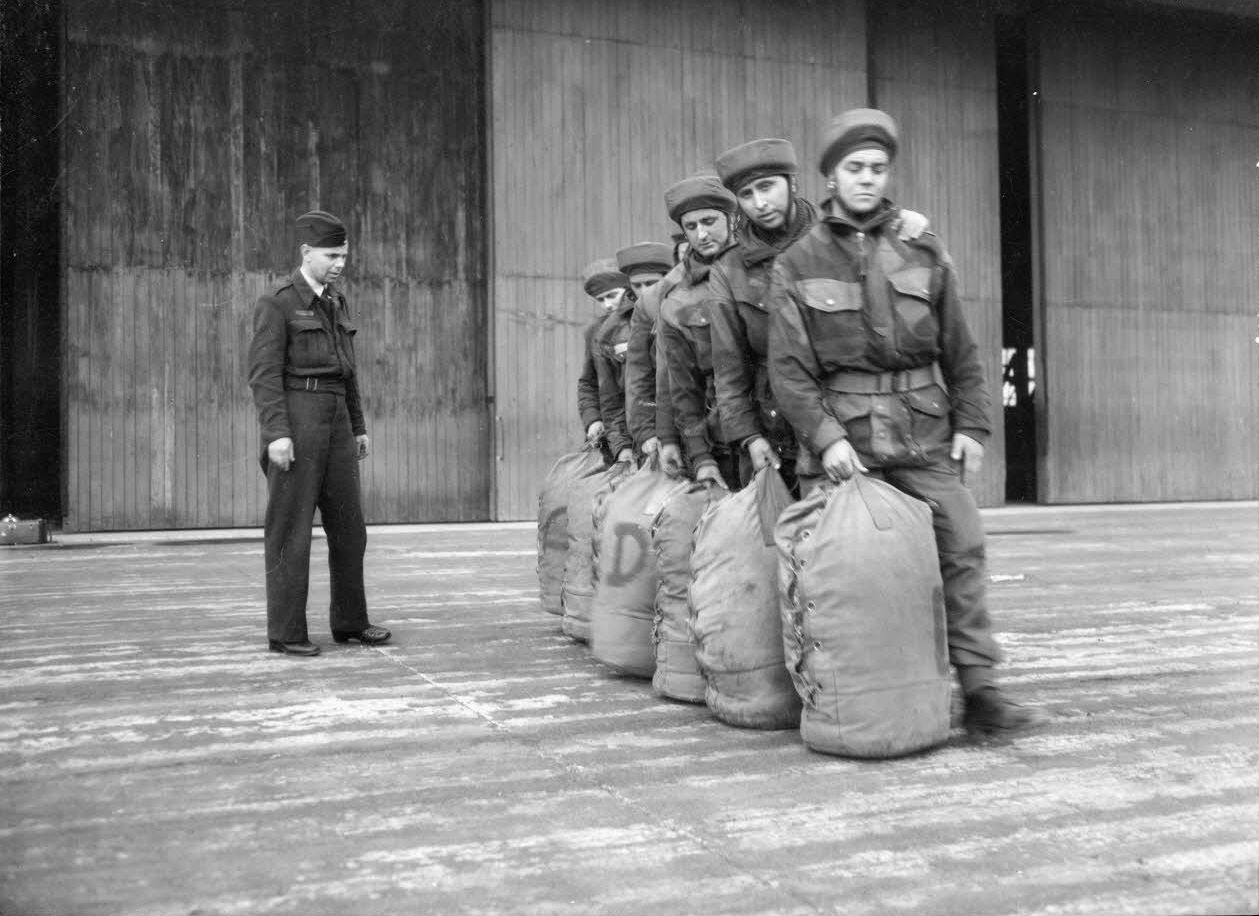 Инструктор Французской роты САС (French SAS Squadron) проводит последнюю проверку курсантов перед посадкой их в самолет для тренировочного прыжка.