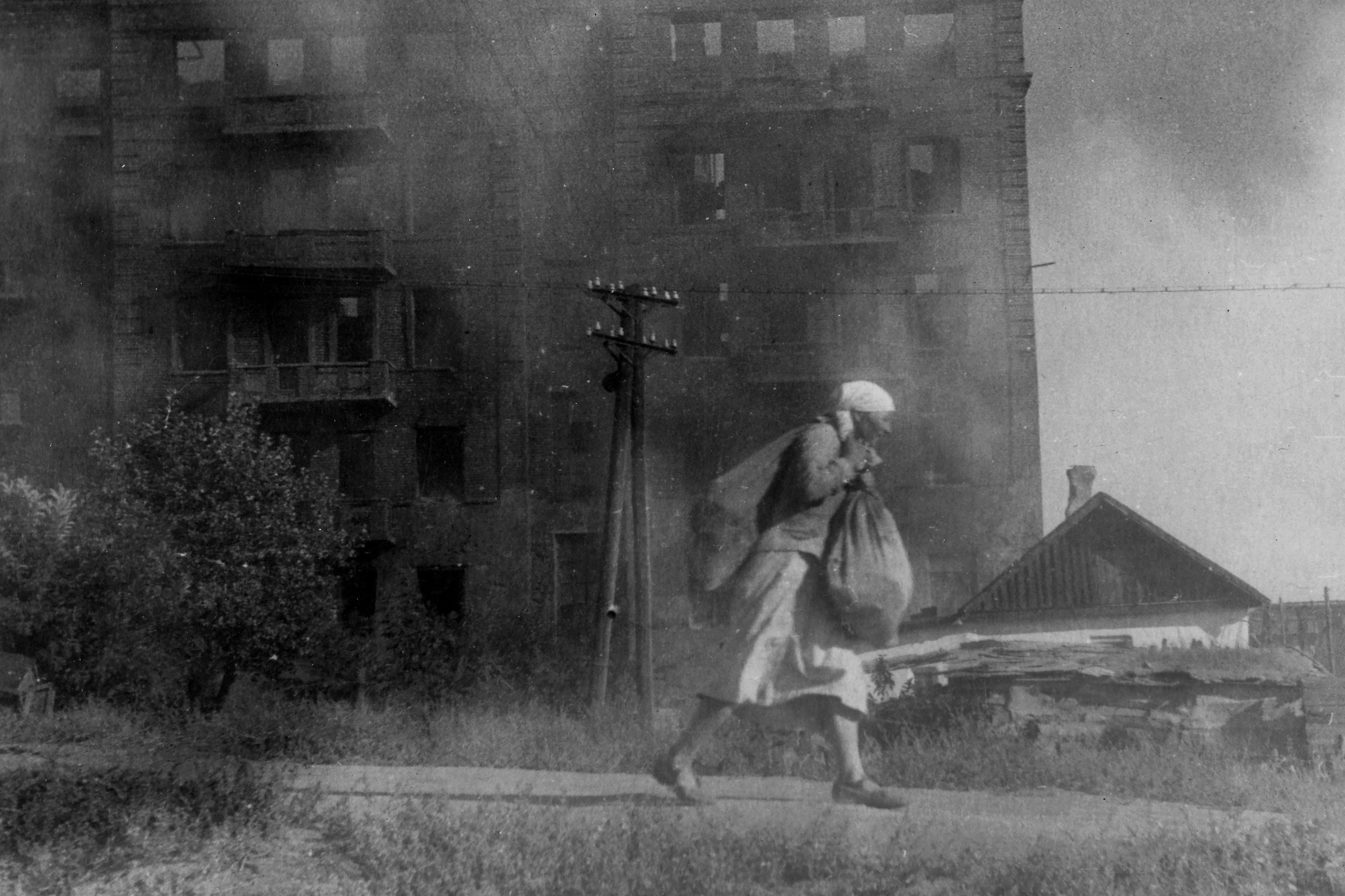 Женщина с вещами на улице освобожденного города Сталино (Донецк)