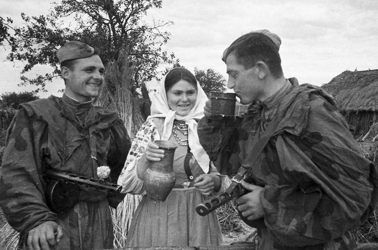 Кресьянка угощает молоком советских разведчиков