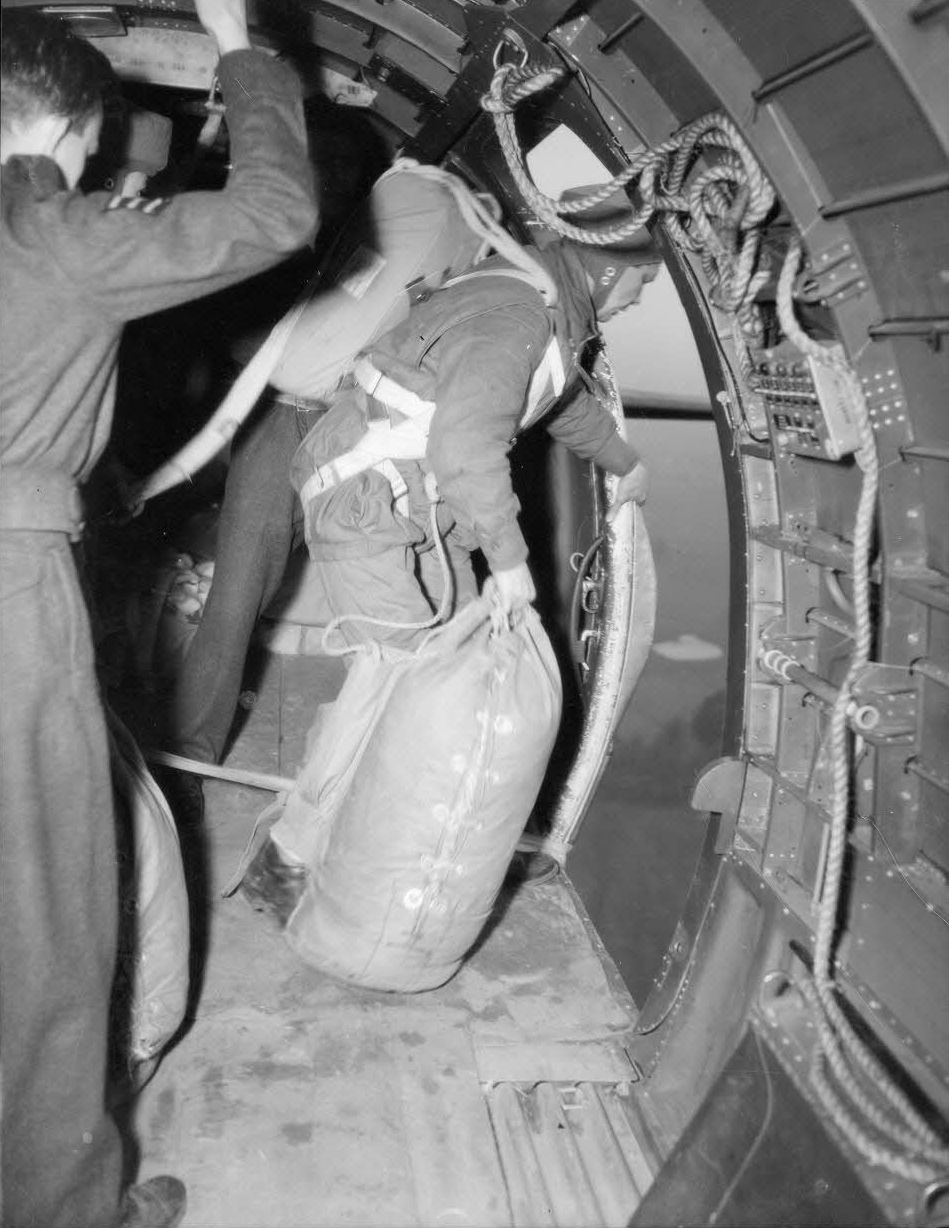 Десантник Французской роты САС (French SAS Squadron) у открытой двери на борту транспортного самолета «Скайтрэйн» (Douglas C-47 Skytrain) перед прыжком.
